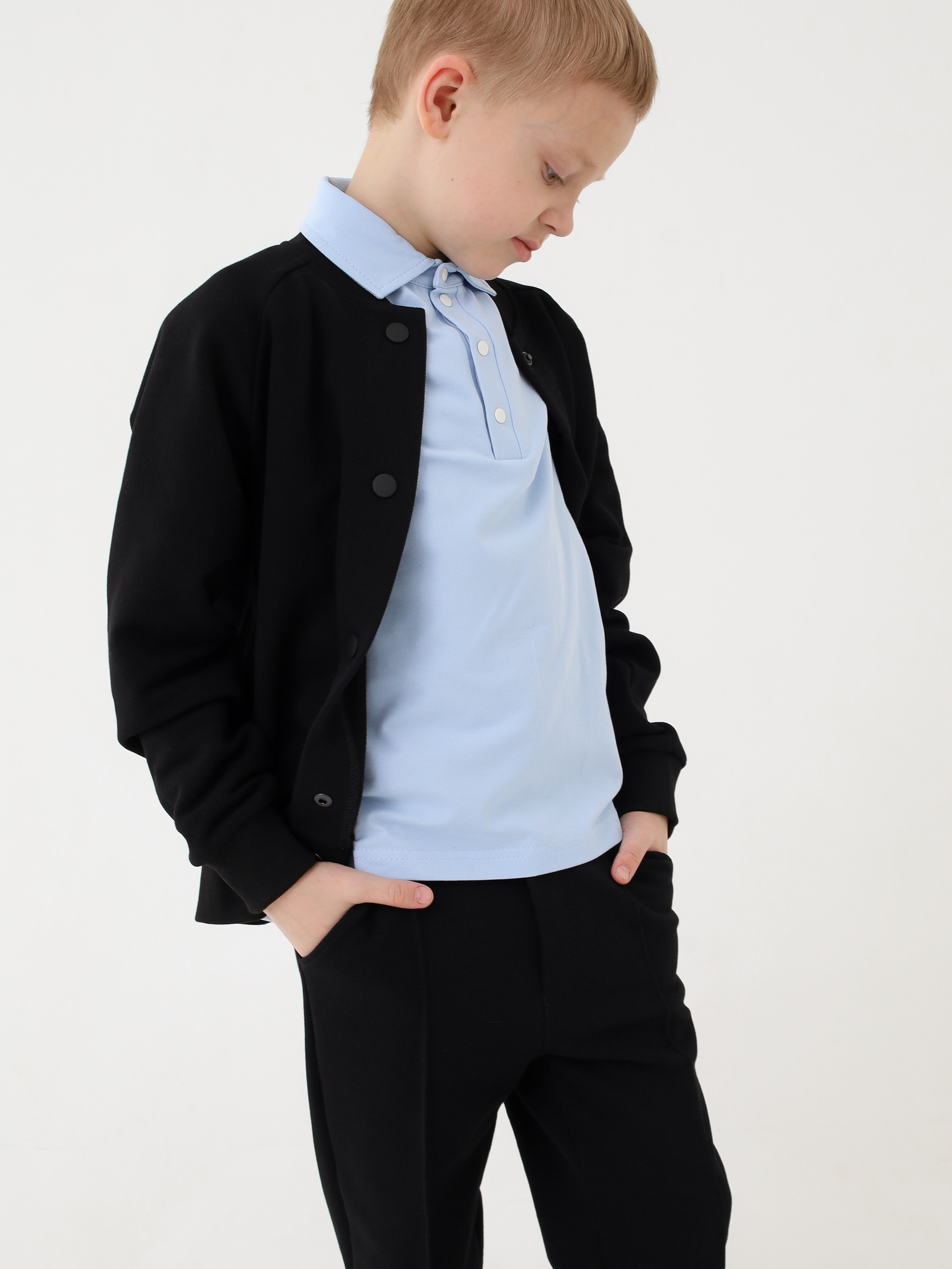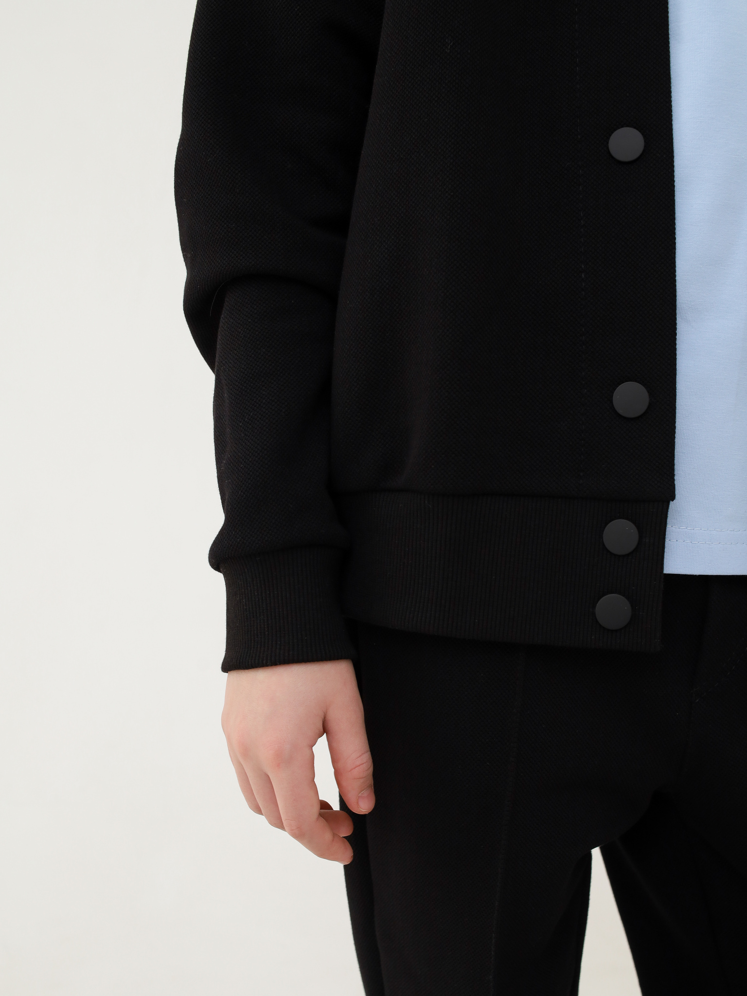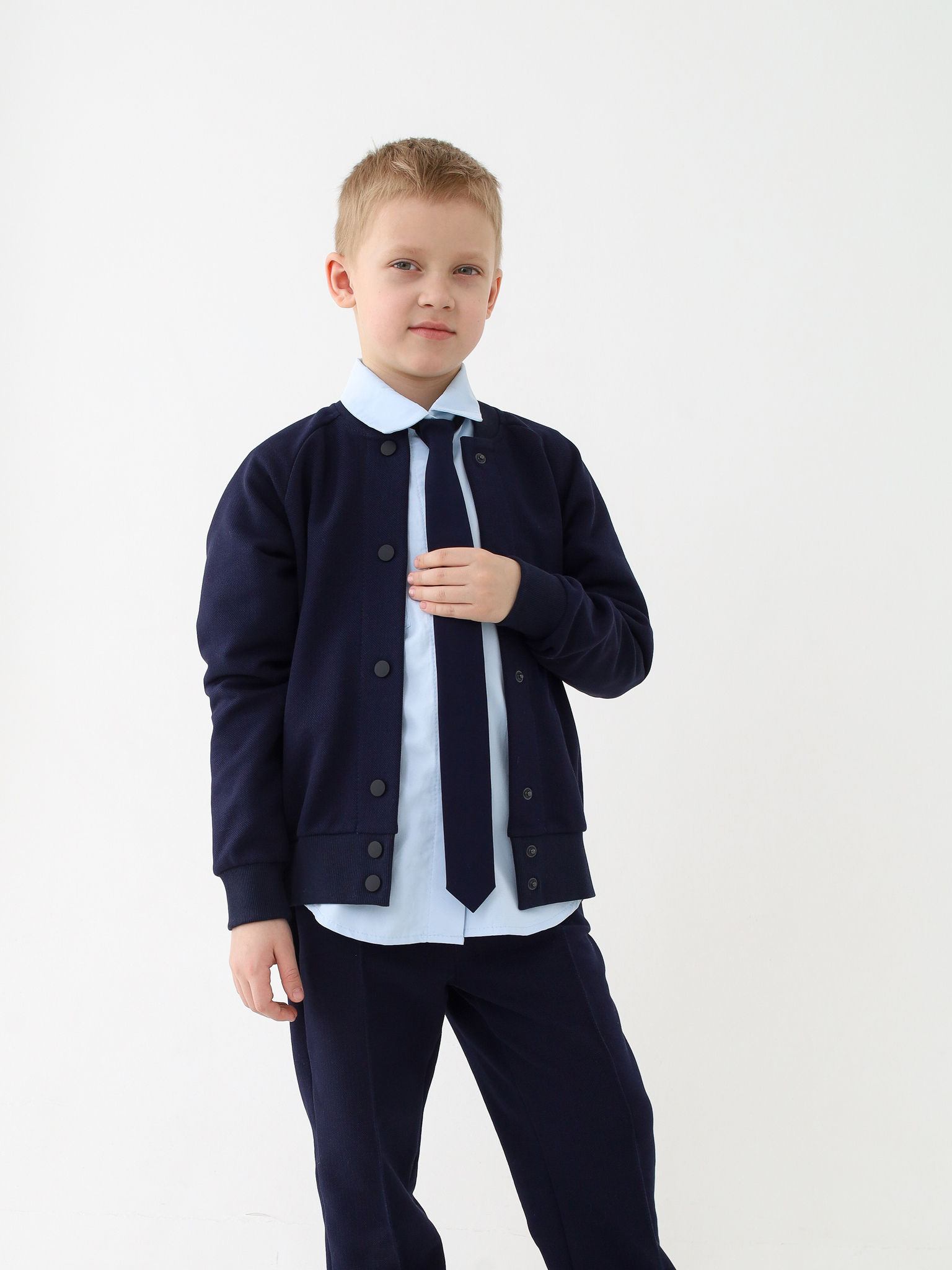 Классический бомбер. Отлично подойдет как для школы, так и в повседневной жизни. Выполнен из текстурированного трикотажа пике. Достаточно плотный, но не толстый. А натуральный состав подарит комфорт и удобство.
