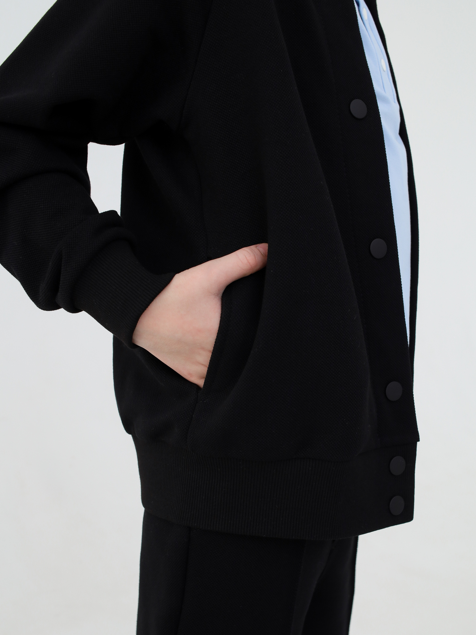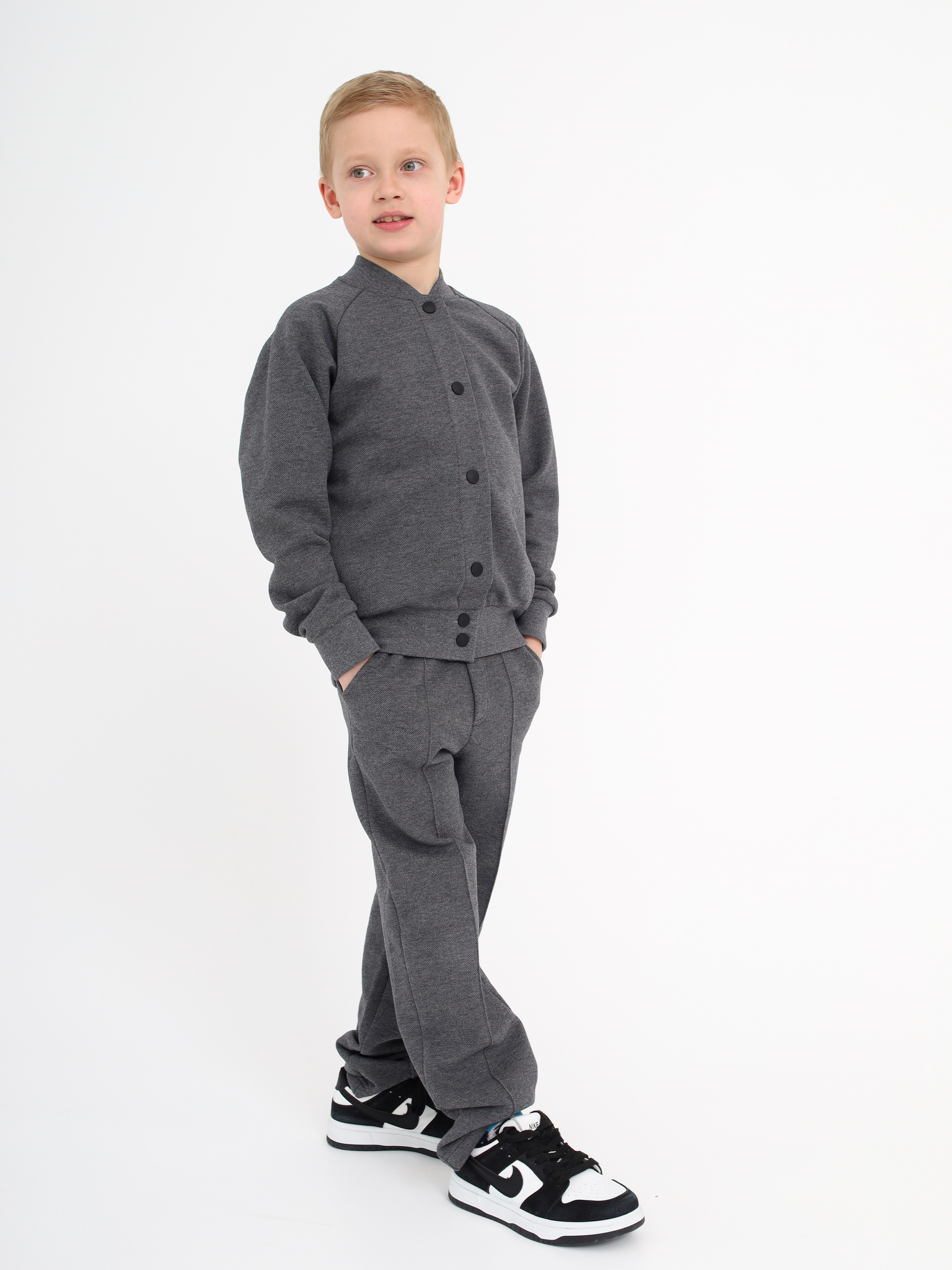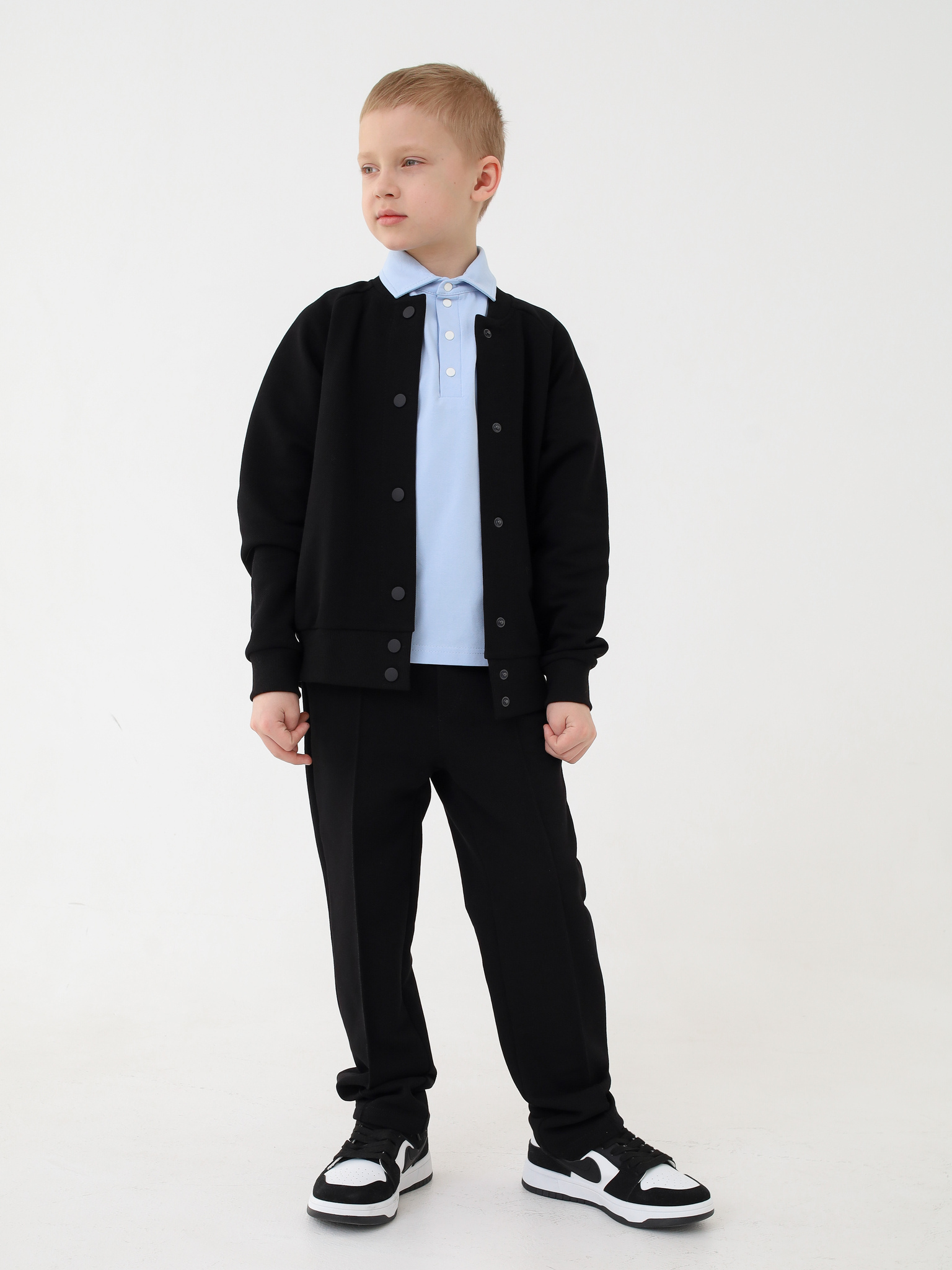 Классический бомбер. Отлично подойдет как для школы, так и в повседневной жизни. Выполнен из текстурированного трикотажа пике. Достаточно плотный, но не толстый. А натуральный состав подарит комфорт и удобство.