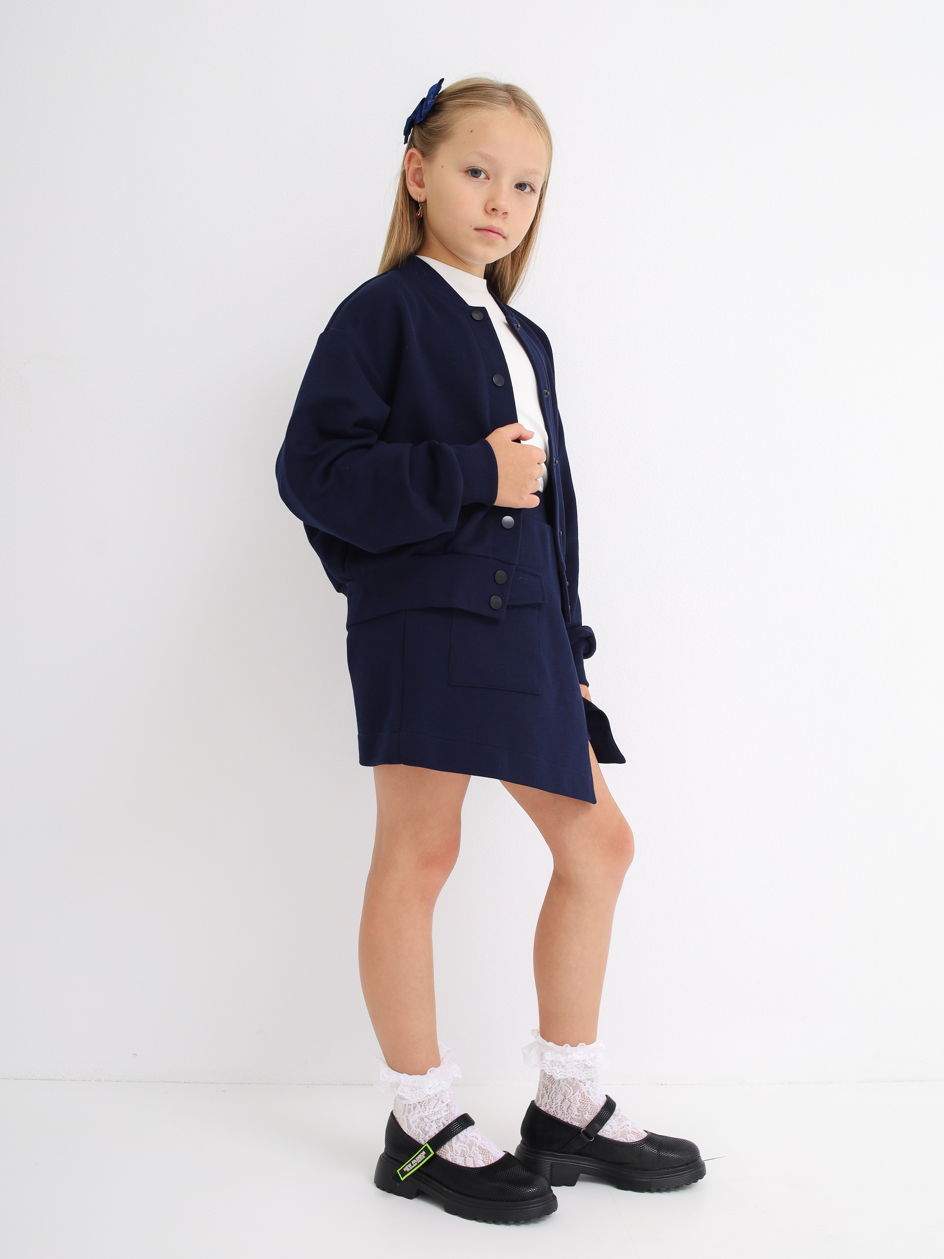 Укороченный бомбер для девочки на кнопках. Прекрасно сочетается как с юбками, так и с брюками. Выполнен из текстурированного трикотажа пике.