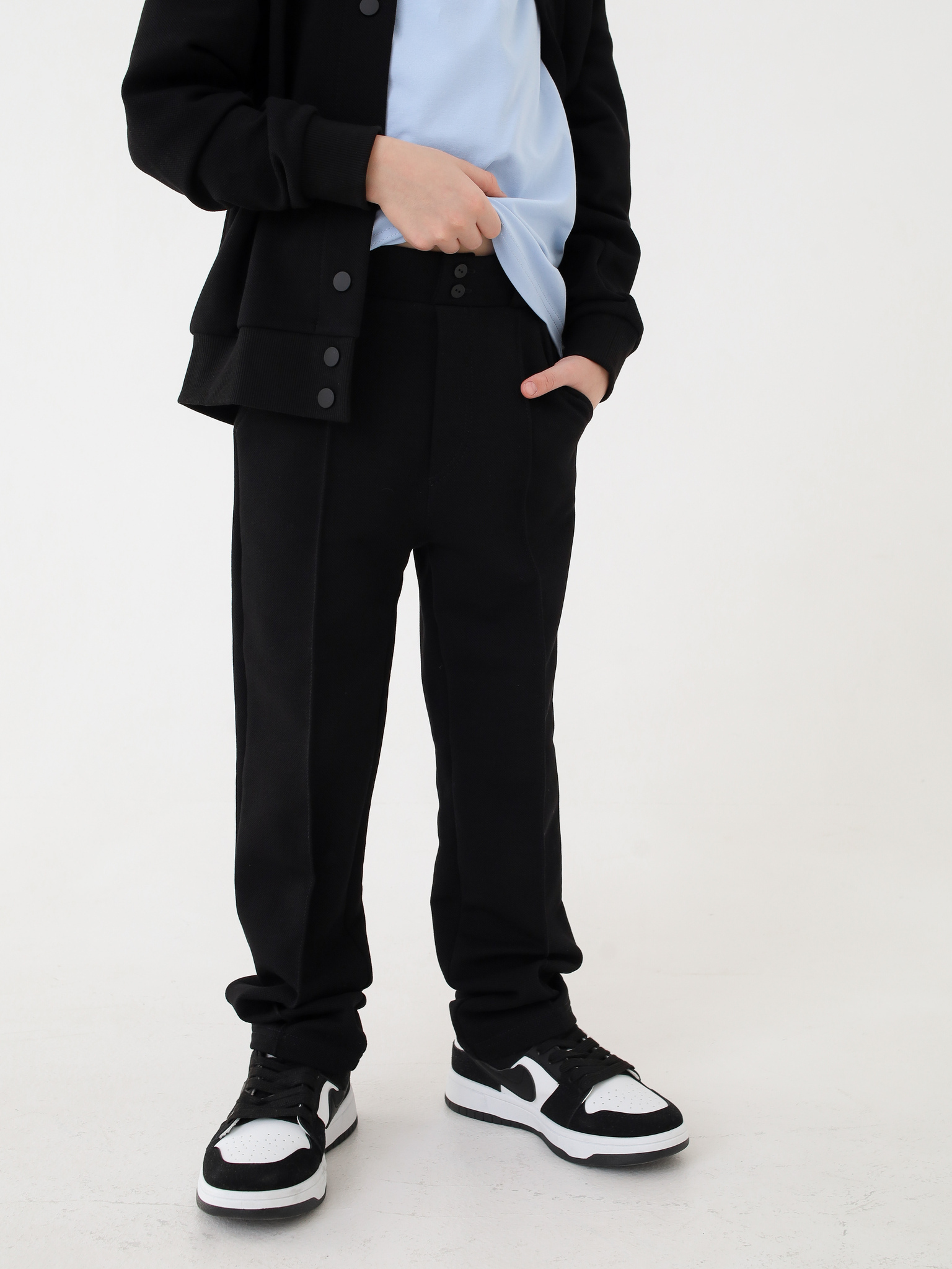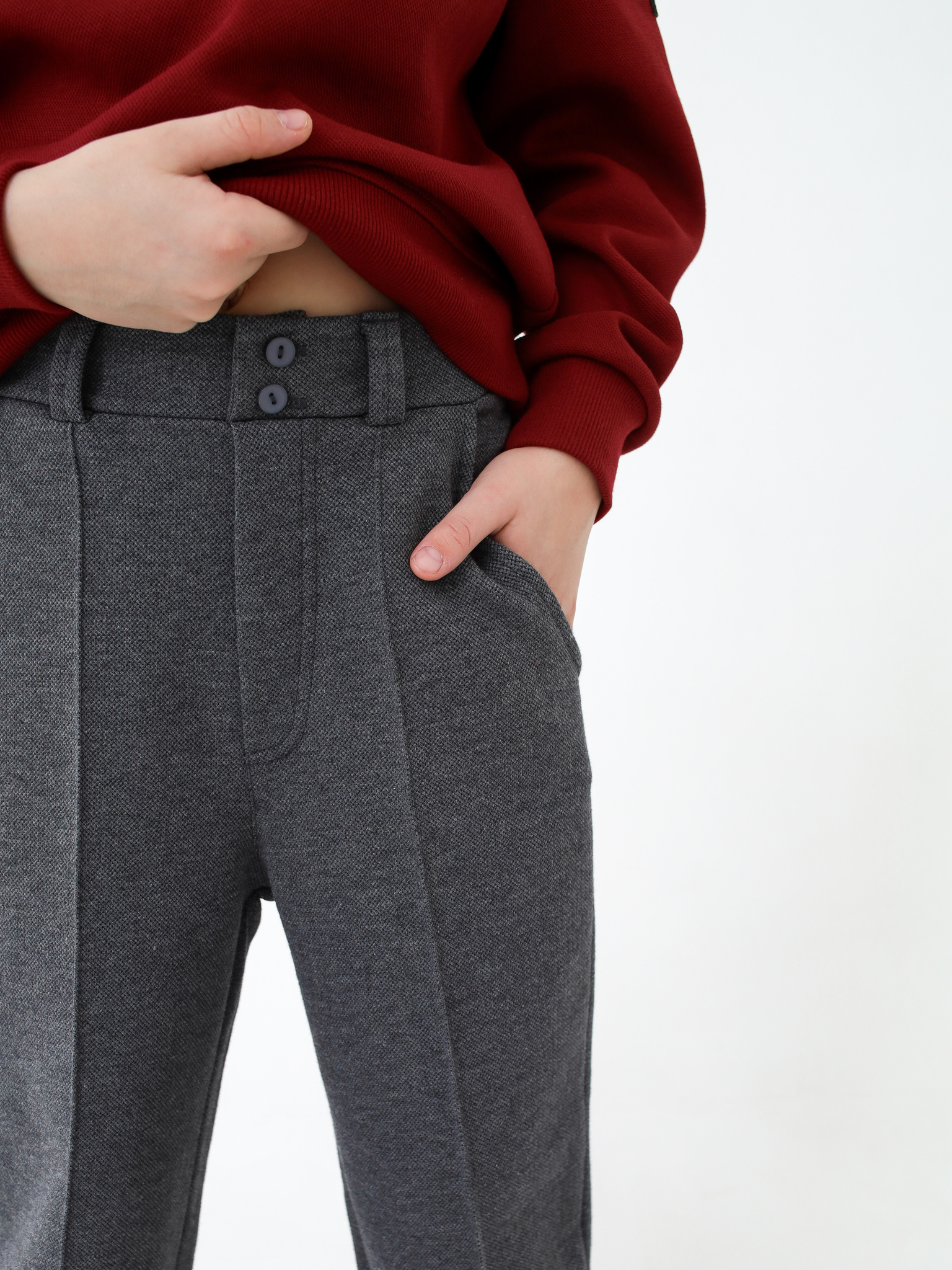 Базовые трикотажные брюки отличная альтернатива классике. Простроченные стрелки, имитация гульфика, шлевки под пояс и два кармашка. Из приятного текстурированного трикотажа пике.