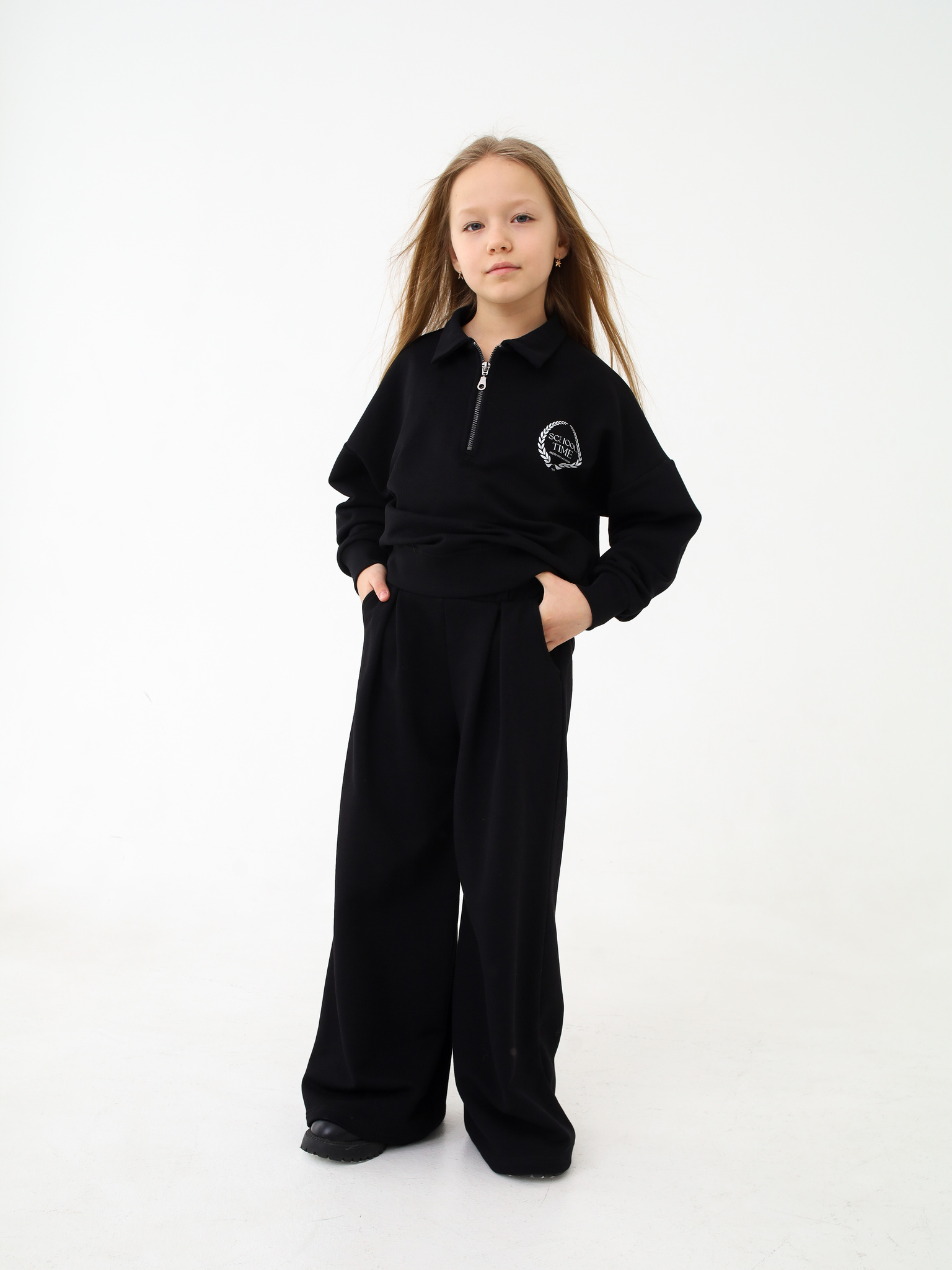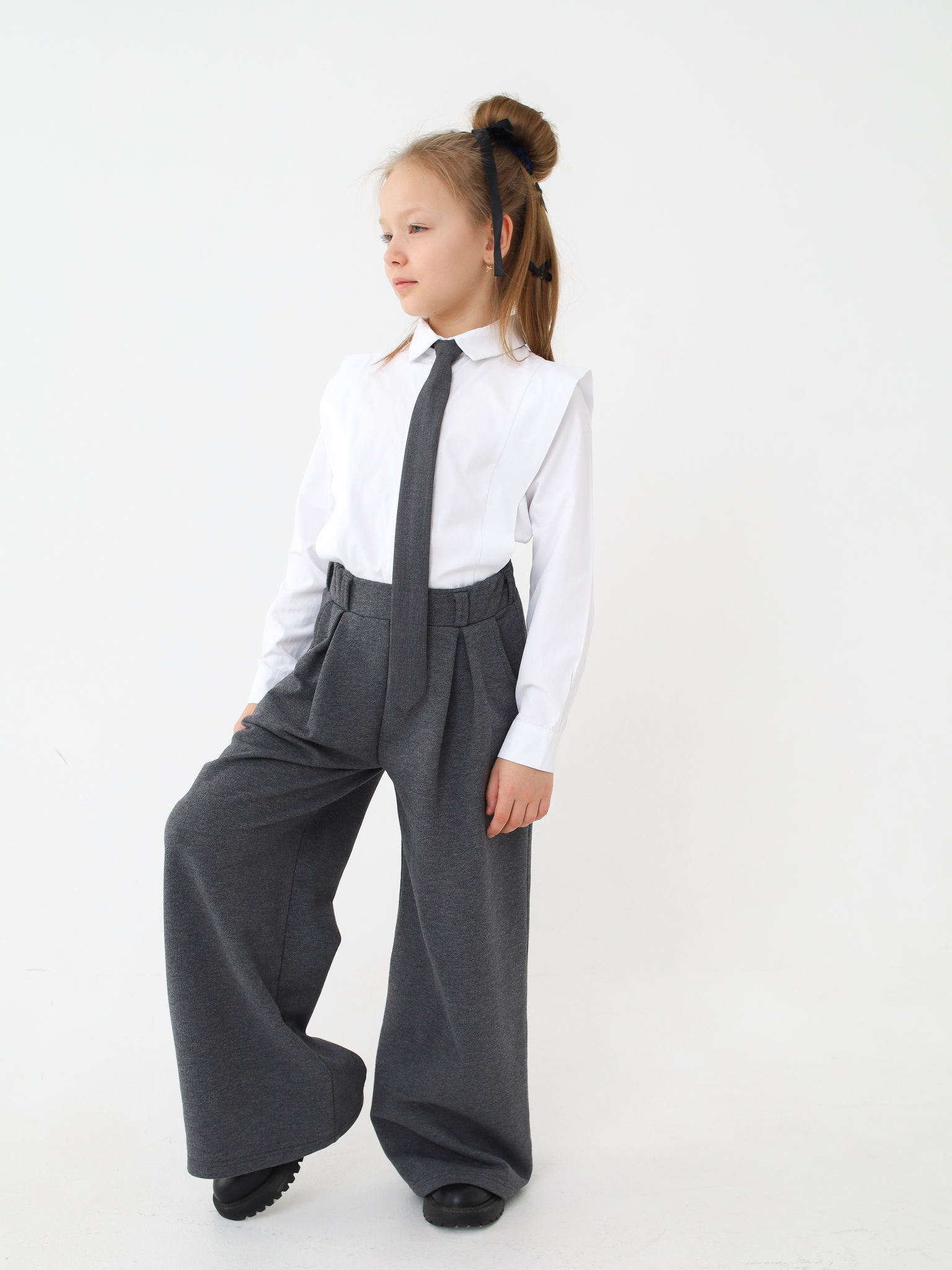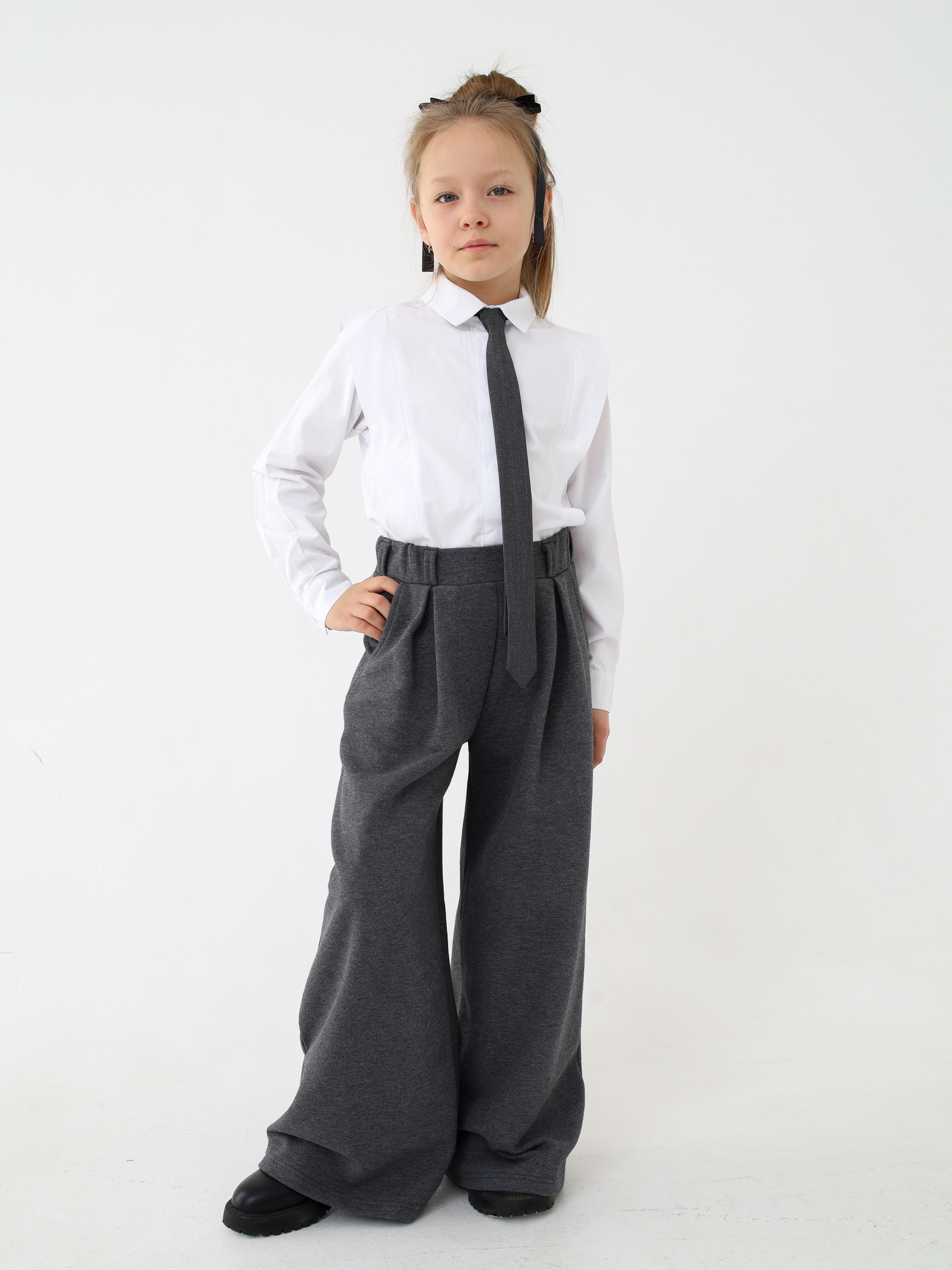 Брюки палаццо тренд школьного сезона. Свободные, удобные, стильные брюки с двумя кармашками и дополнительными выточками. Сочетаются как с блузами, так и с футболками, свитшотами и рубахами. Выполнены из приятного текстурированного трикотажа пике.