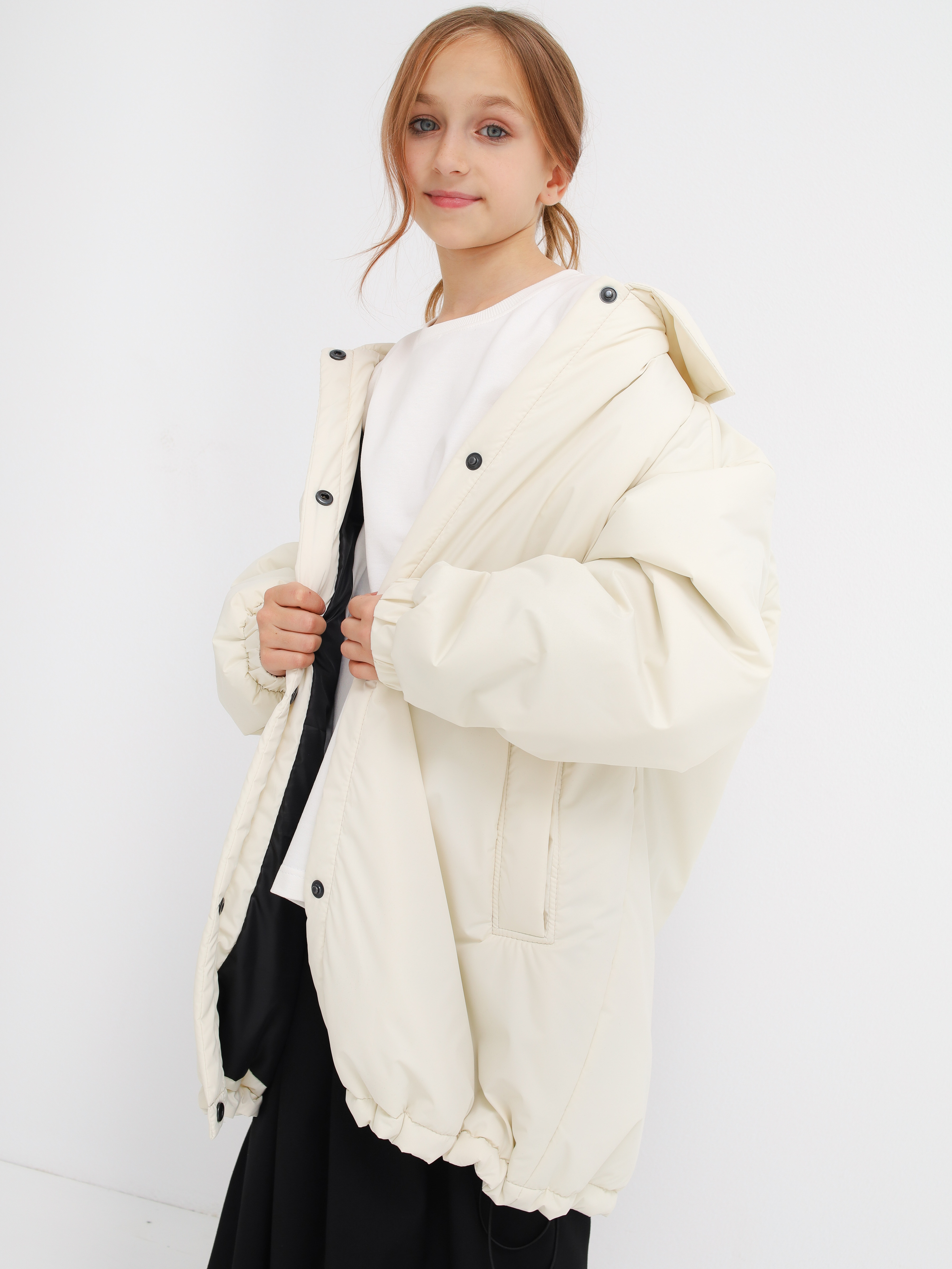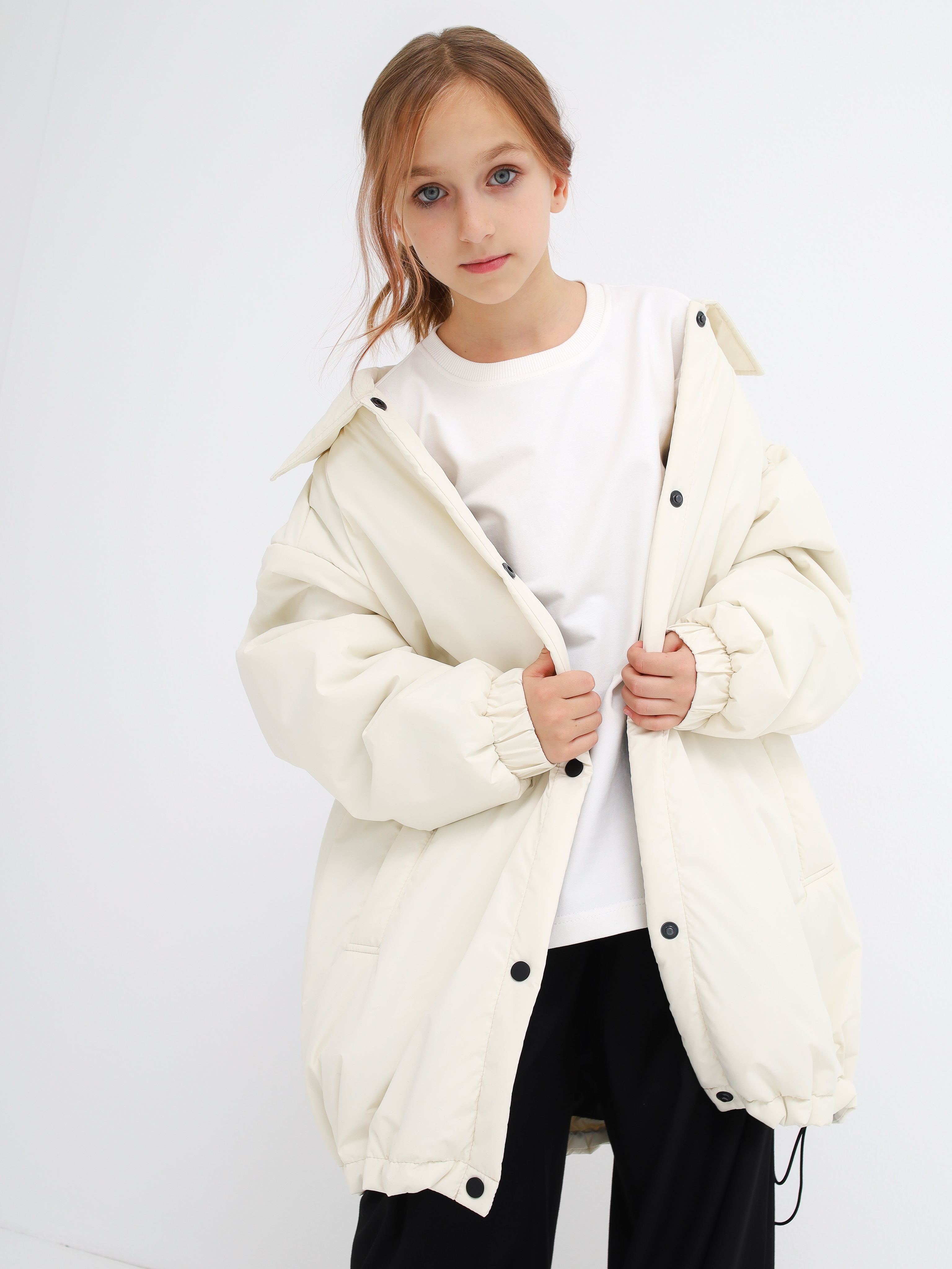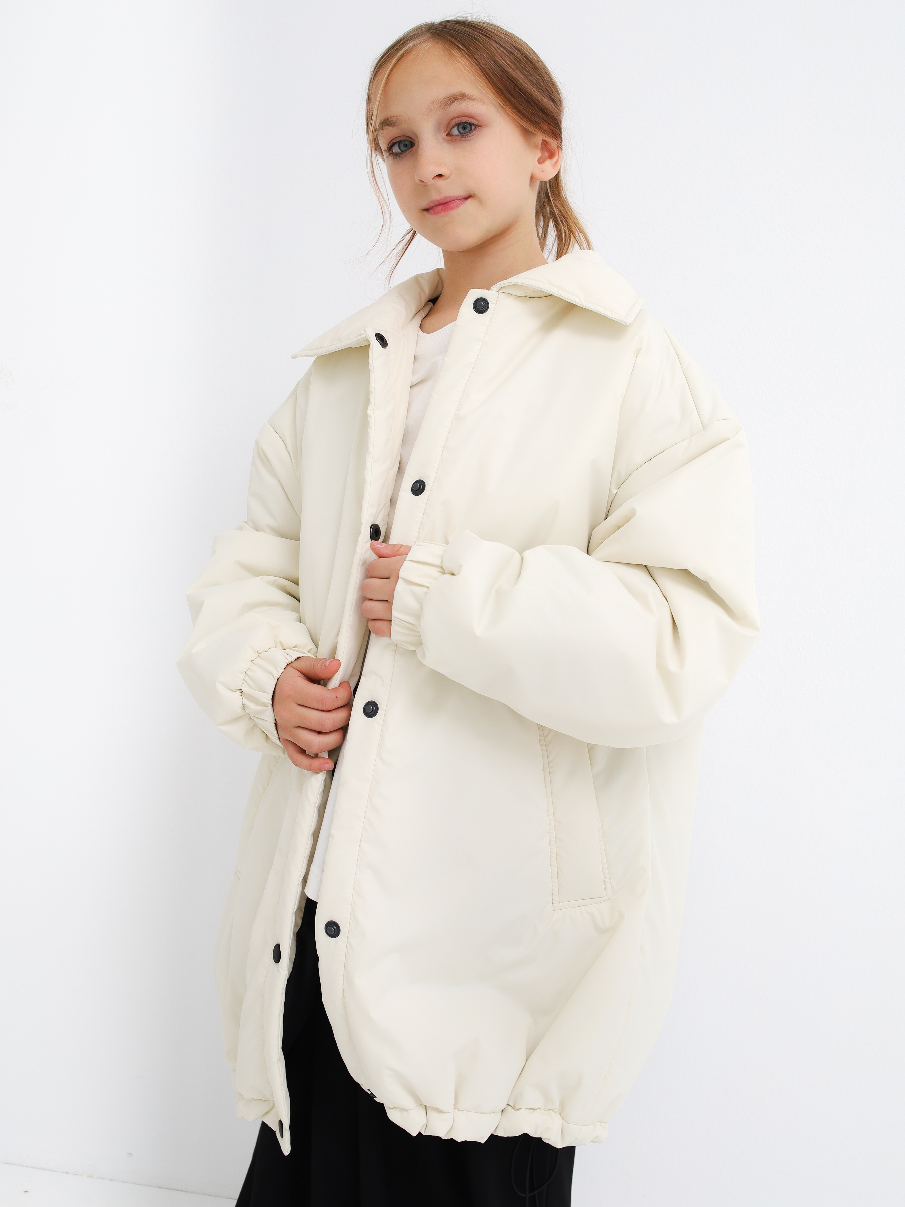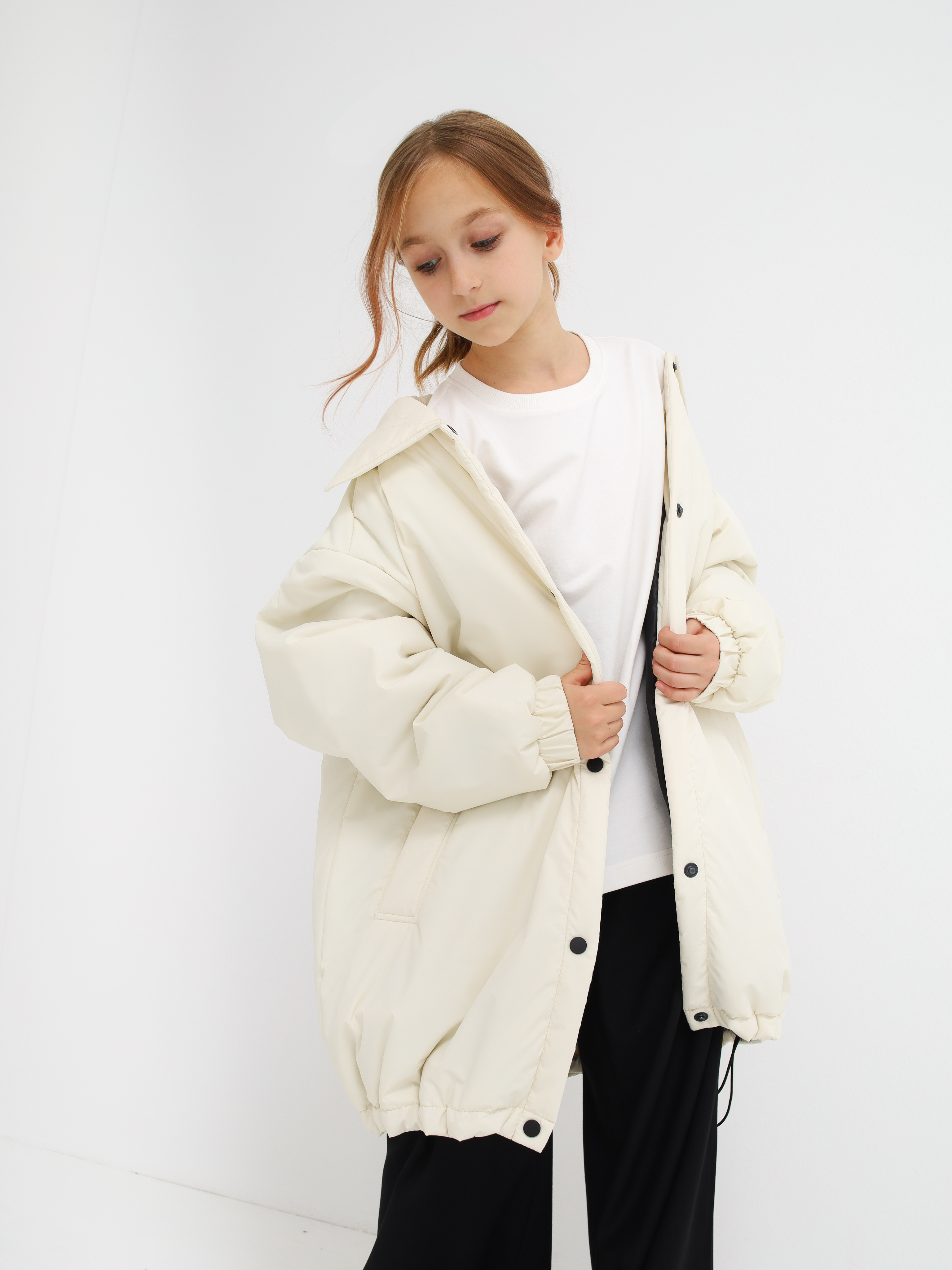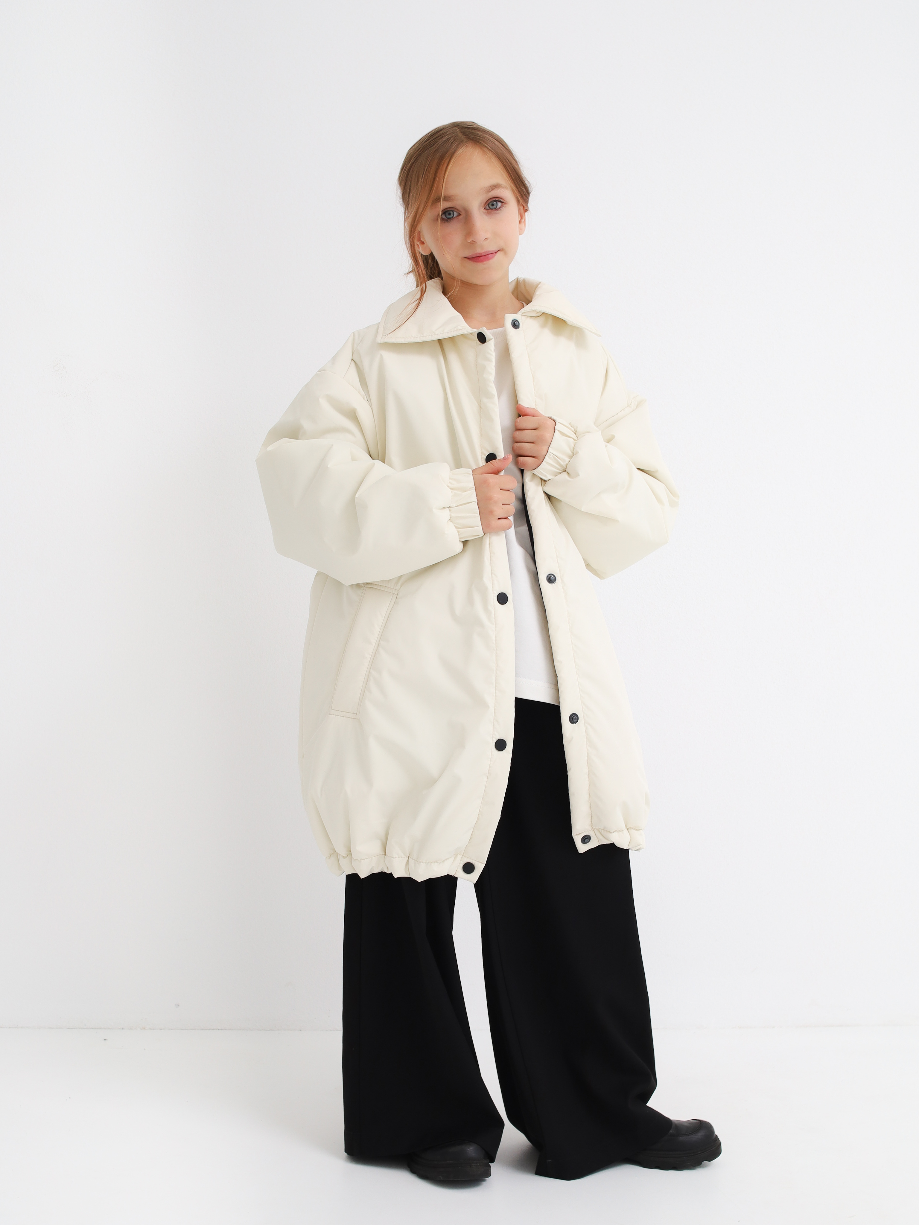 Объемная лаконичная куртка-рубашка на кнопках. По низу на утяжке. Температурный режим от -5 до -+10 градусов.
