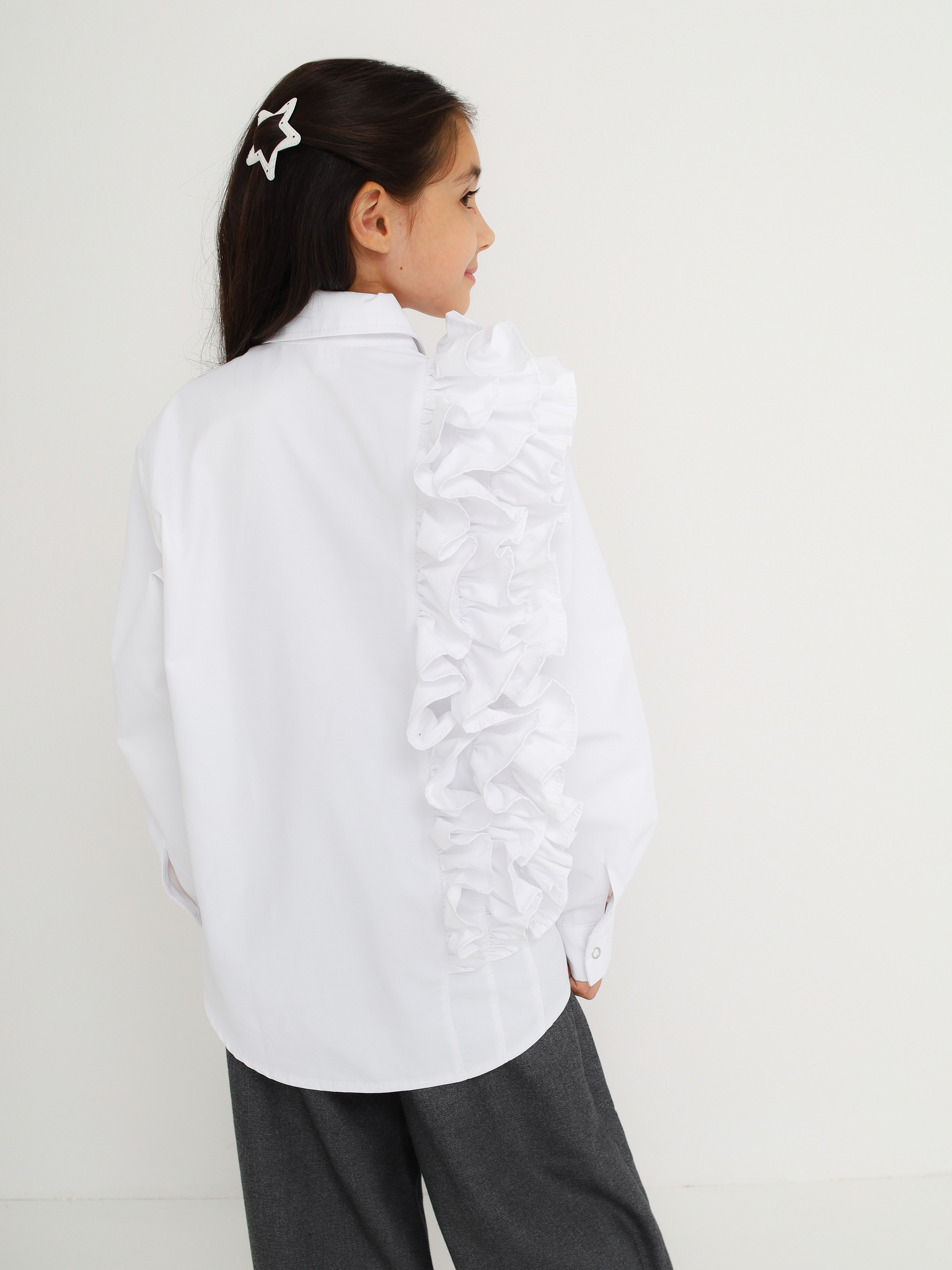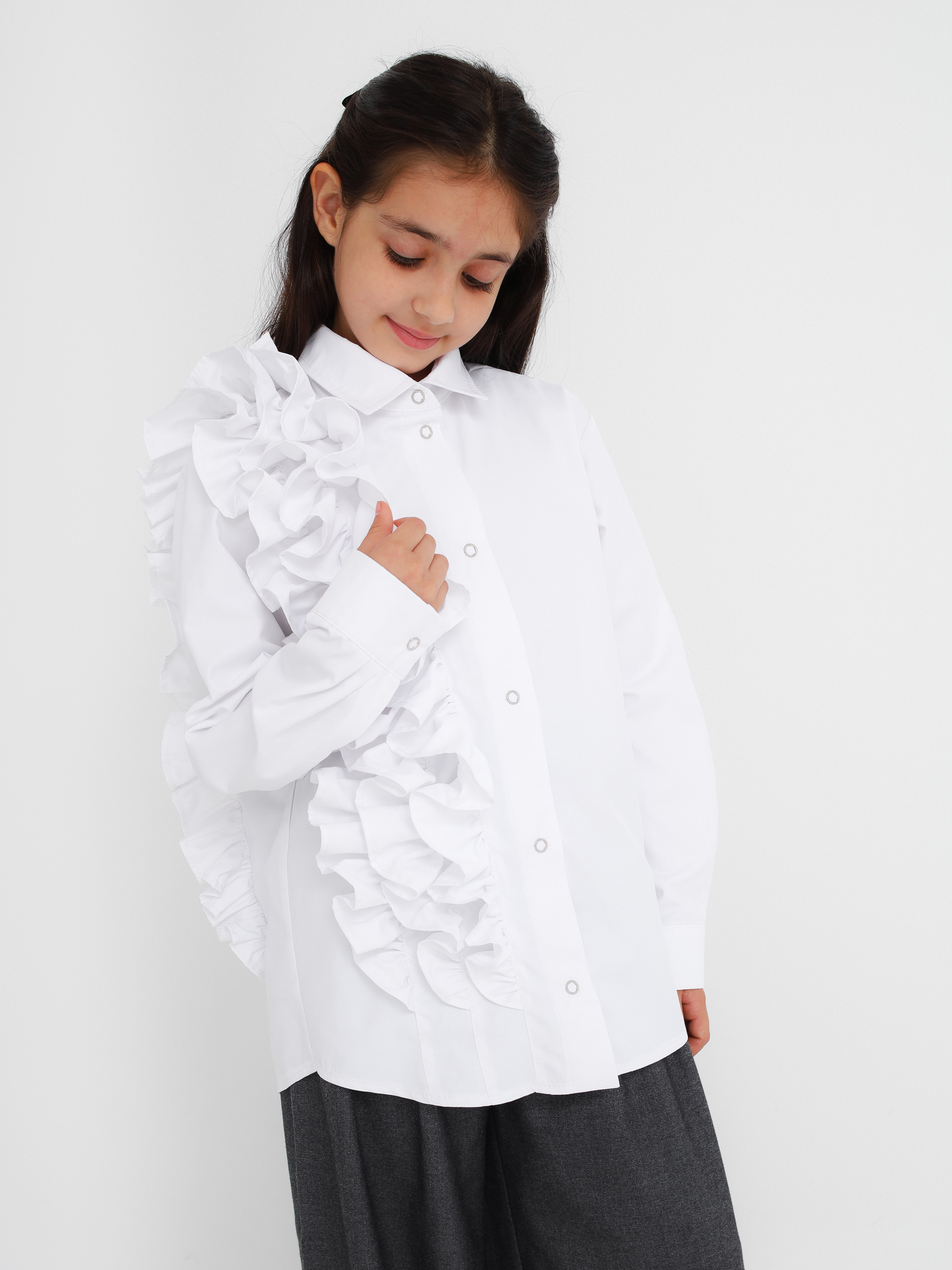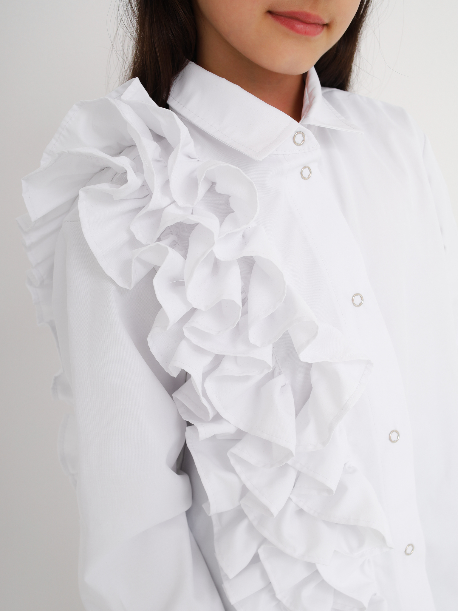 Нарядная белая рубашка из мягкого текстиля с рюшами. На кнопках.
