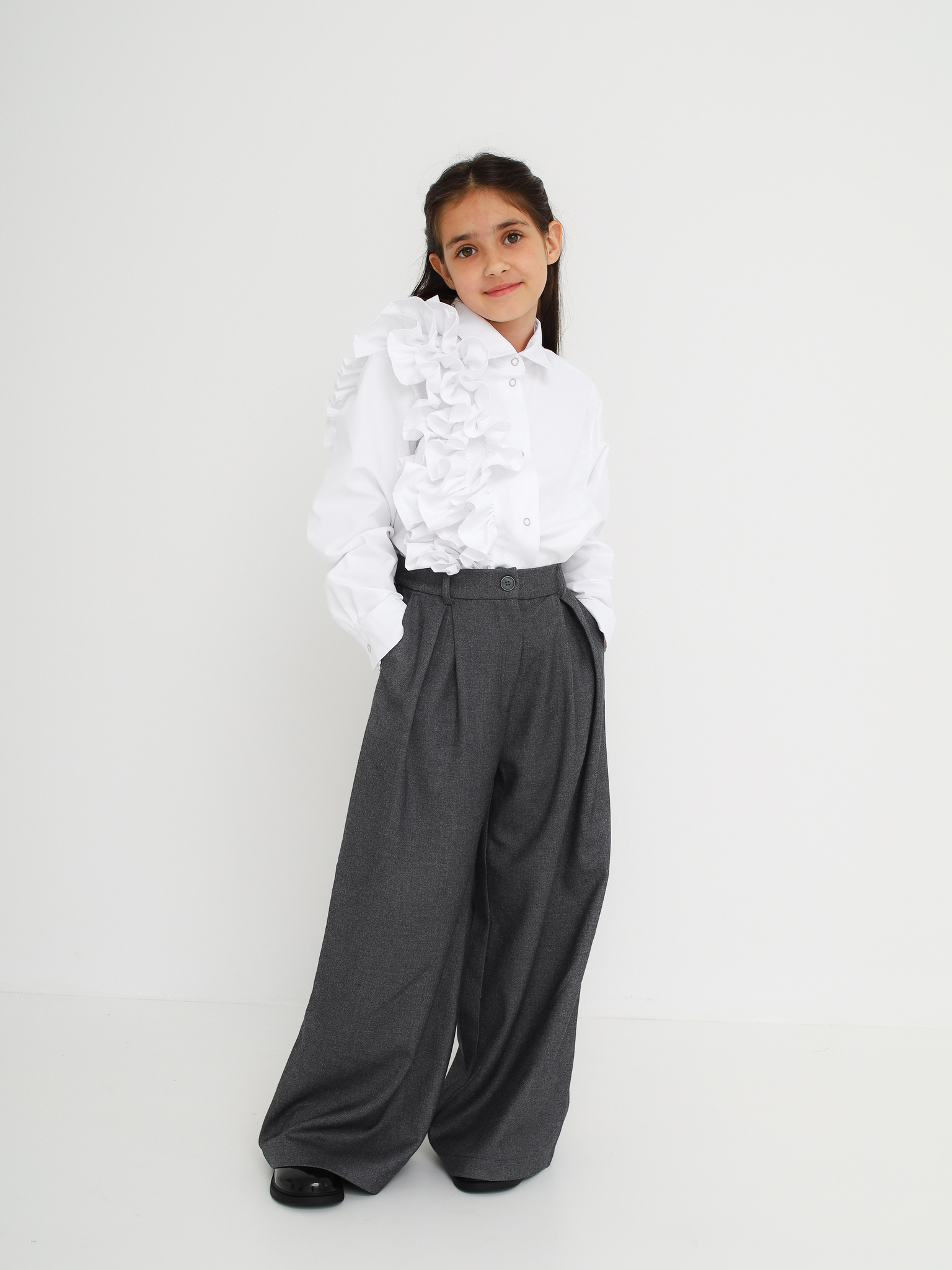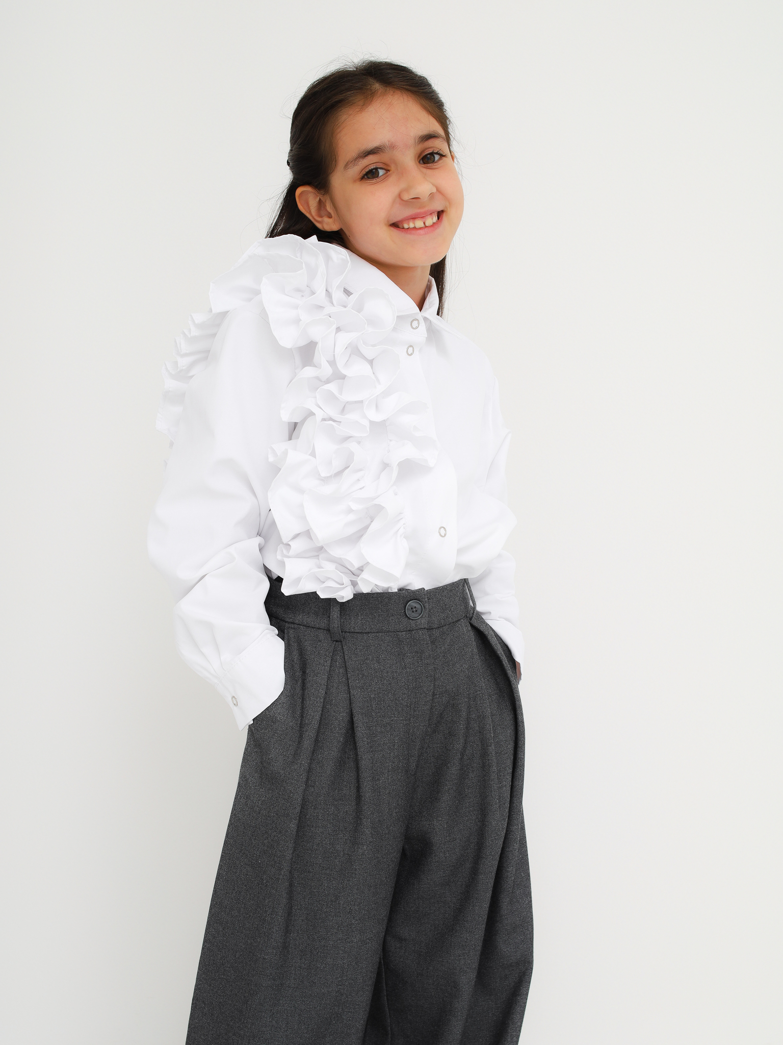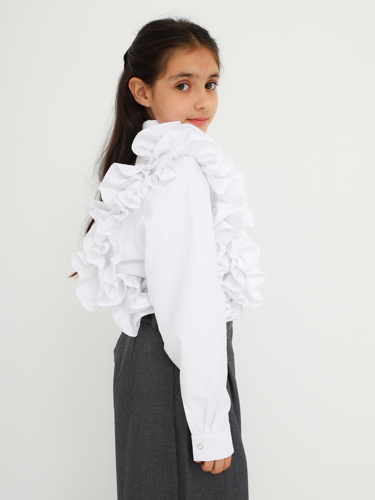 Нарядная белая рубашка из мягкого текстиля с рюшами. На кнопках.